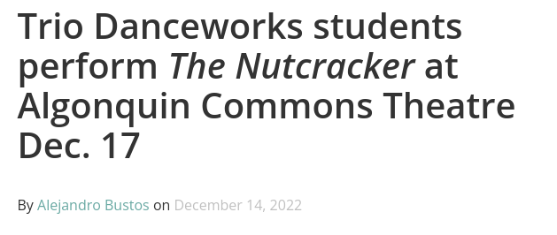 Our annual production of The Nutcracker will be back at Algonquin College Saturday, December 13th, 2025 at 4 PM and Sunday December 14th, 2025 at 11AM.